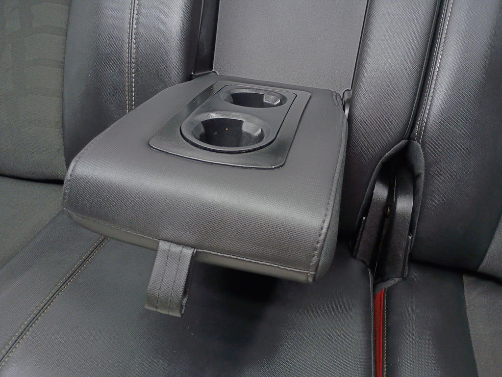 Ram 4th Gen Rebel Crew cab Red and Black Rear Seats with cloth inserts and synthetic leather.