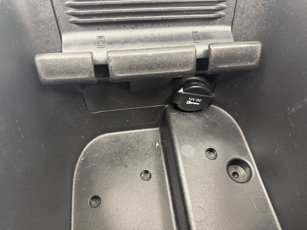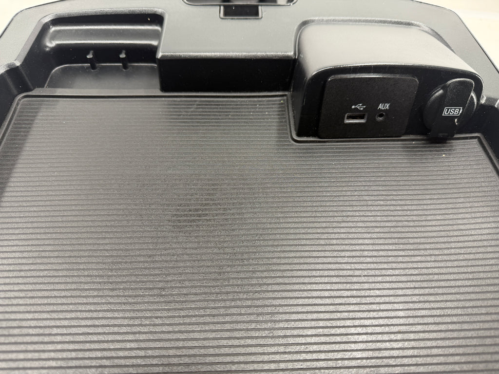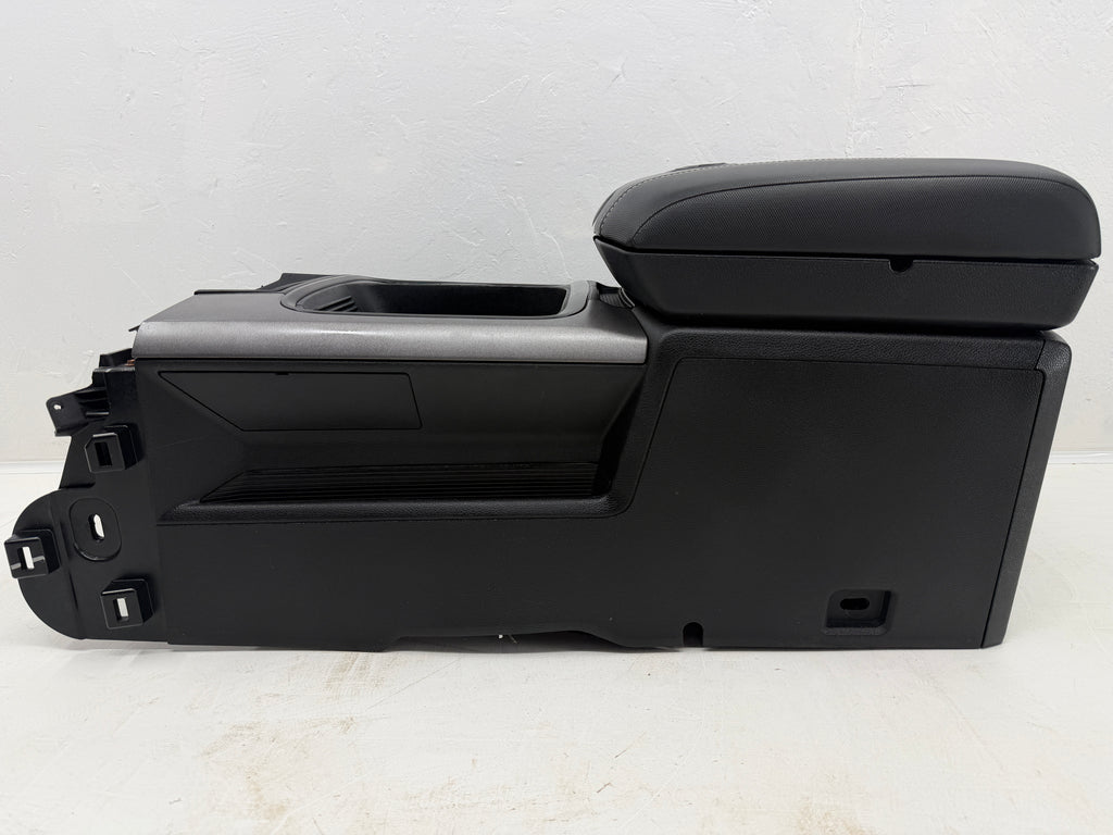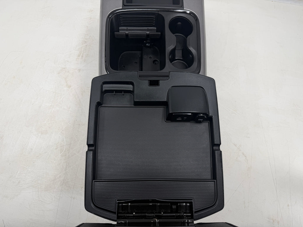 Ram Center console with storage and cup holders, it is black and gray in color, it also has USB, USBC, and 12 volt power supplies. It also Boasts rear HVAC.