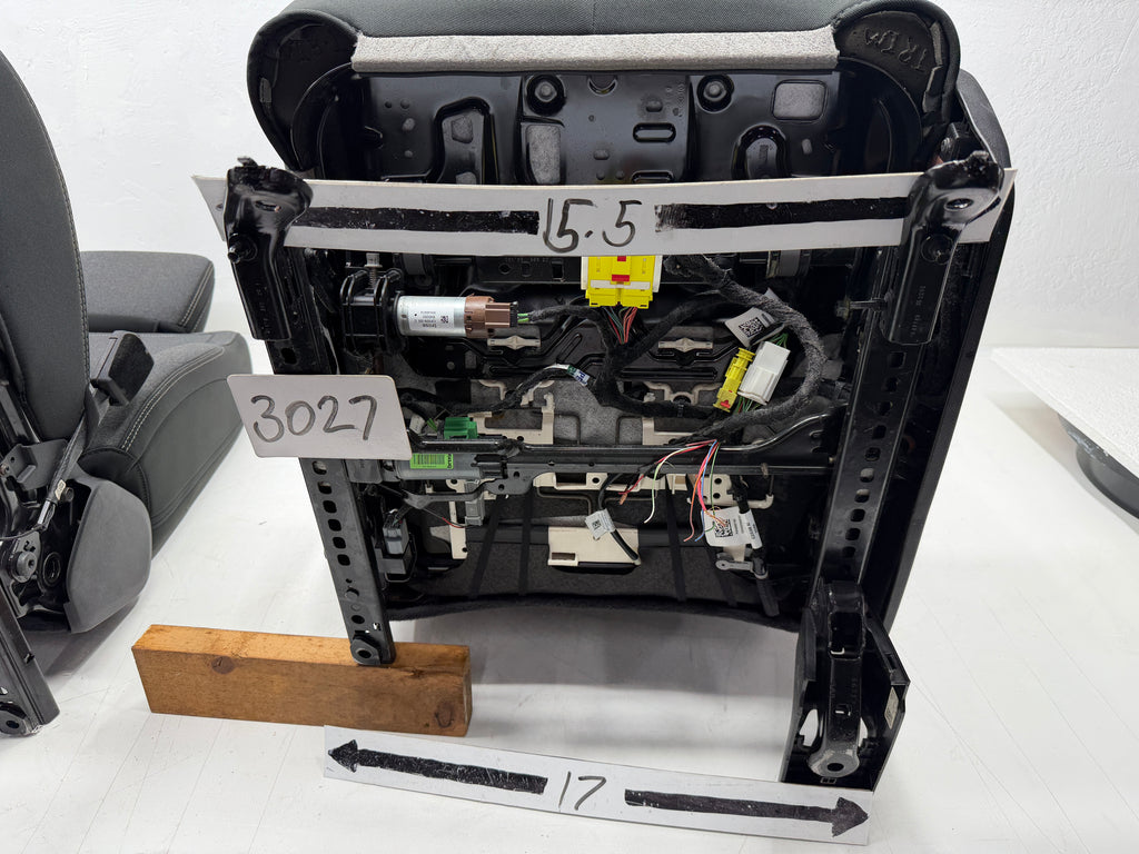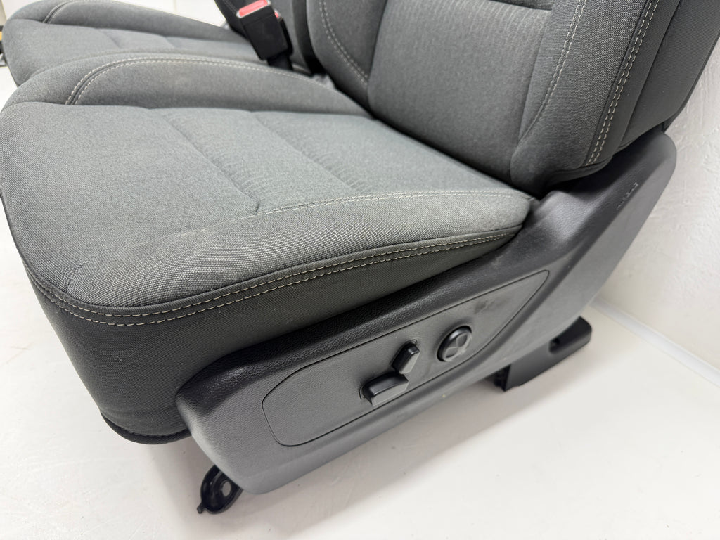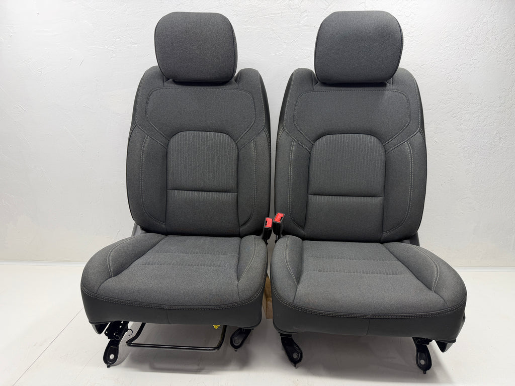 These seats were removed from a 2023 Ram 1500 with 23k miles, with the "Premium Black Cloth" interior, they are a dark grey & black cloth with a patterned insert.