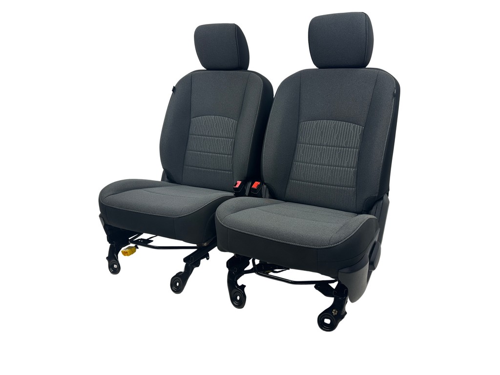 2021-2025 Ram Heavy Duty front seats, with the new pattern black cloth. Heavy Duty Rams include the 2500, 3500, 4500 and 5500. These seats have manual tracks.